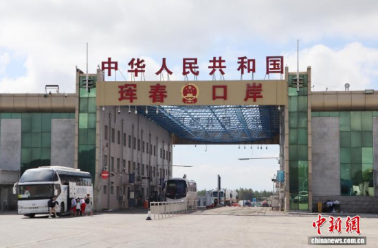 7月19日,吉林琿春,運(yùn)輸?shù)弁跣返目ㄜ嚺抨?duì)入關(guān)。 中新社記者 蔣文月 攝